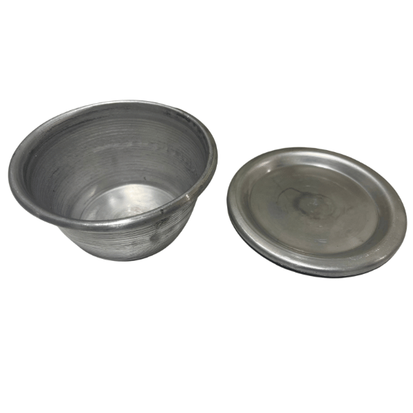 Enjoy deliciously steamed Moi-Moi in a convenient, reusable aluminum cup with a secure lid. Perfect for home or takeout, this cup helps retain the freshness and flavor of your favorite beans pudding.